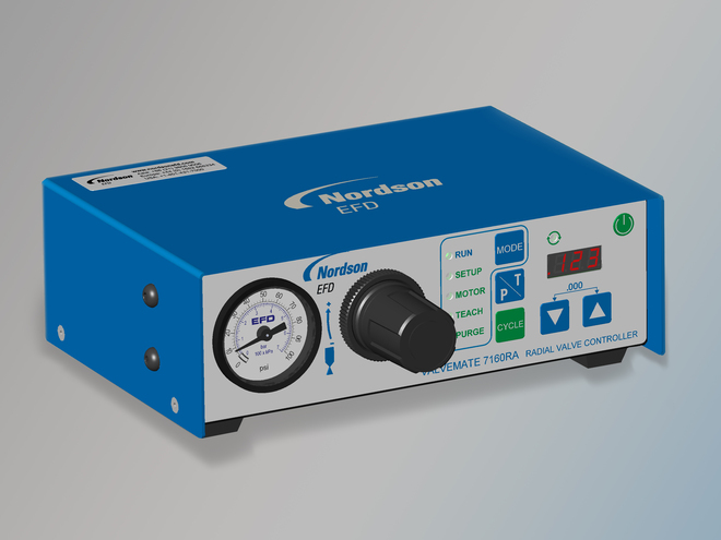 Nordson EFD’s ValveMate™ 7160RA radial system controllers provide built-in regulators to ensure high nozzle air efficiency without overspray.