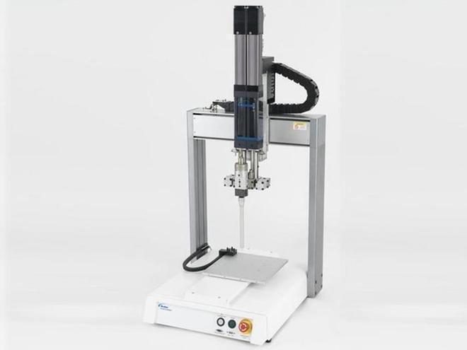 Automated 3-axis benchtop dispensing system for the efficient and consistent application of adhesives and sealants. Featuring a gantry mounted meter that enables greater shot accuracy with wide and difficult ratio materials.