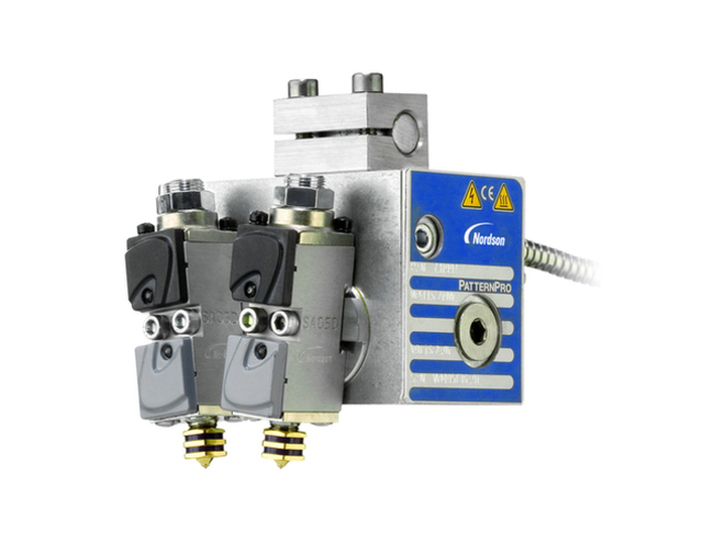 PatternPro hot melt adhesive dispensing guns include a pivoting module design that significantly reduces product changeover time in tray-making, wrap-around side gluing and cartoning.